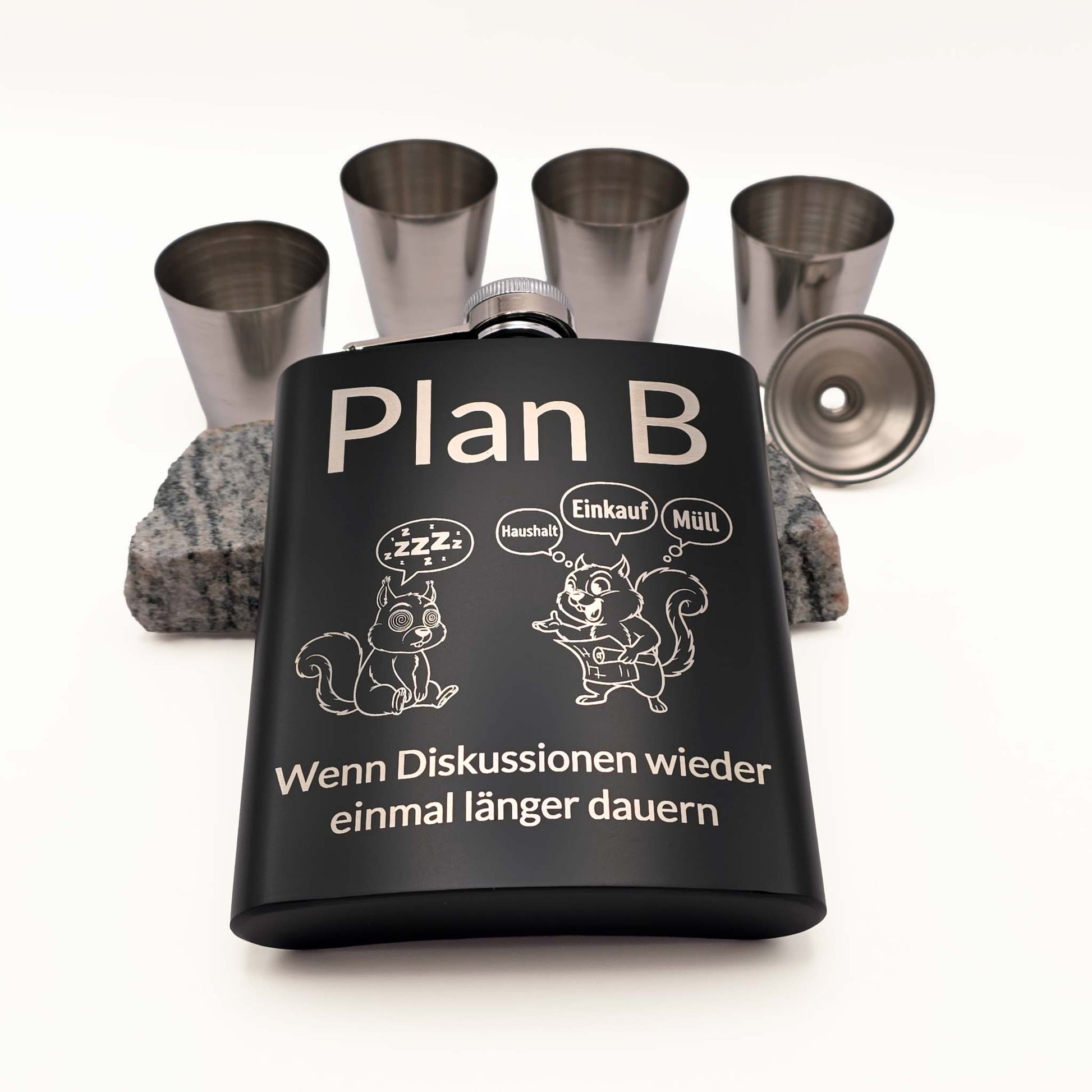 Manchmal braucht man einfach einen "Plan B". Das Set besticht durch sein matt-schwarzes Design und die humorvolle Gravur, welche man mit einem Augenzwinkern nehmen sollte. Durch das umfangreiche Zubehör mit vier Bechern und einem praktischen Einfülltrichter ist es das ideale Set zum Teilen in geselliger Runde.